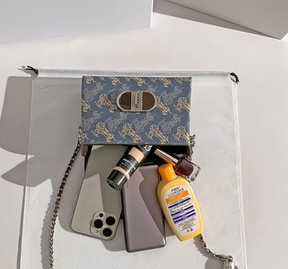 This structured blue handbag features an elegant vintage-inspired print, rich brown PU leather details and a bold silver-tone lock that instantly elevates any outfit.